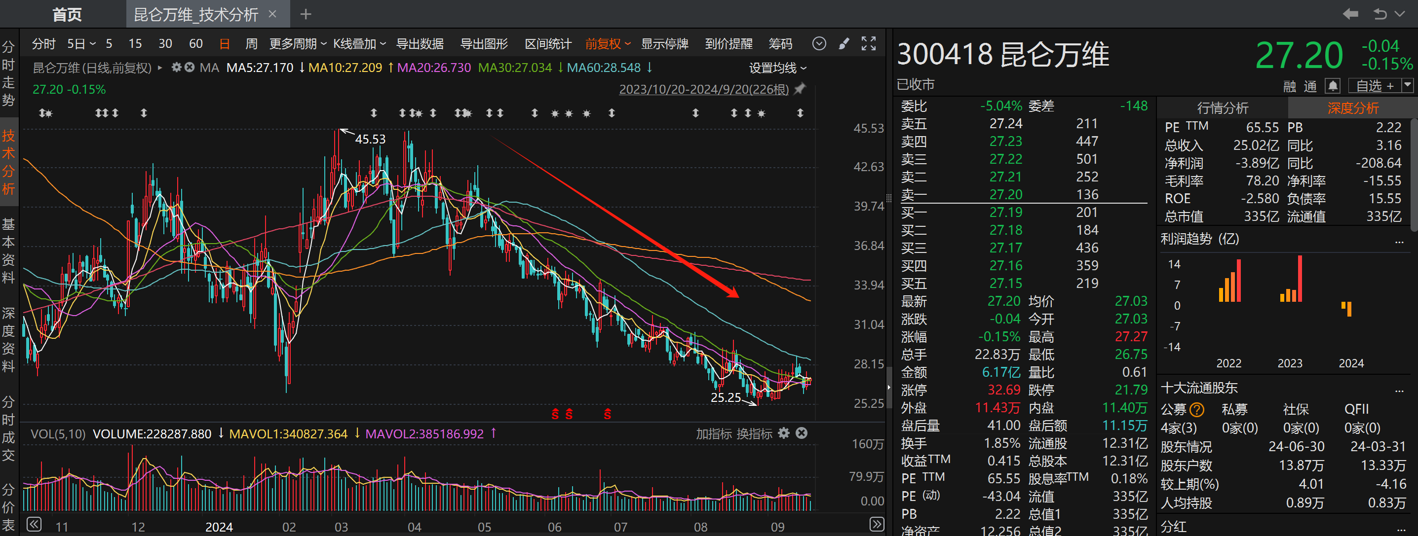 昆仑万维7月1日公告,公司控股股东、实际控制人周亚辉及其一致行动人盈瑞世纪承诺未来五年不减持公司股份。昆仑万维的主营业务为AGI与AIGC业务、海外信息分发与元宇宙业务、投资业务。昆仑万维主要产品和服务包括增值服务业务、搜索业务、广告业务等。国元证券李典在8月3日发布的研报中表示,在AGI与AIGC业务上,昆仑万维多款AI产品已经在全球范围内成功落地。商业化方面,天工大模型于电信运营商、主流手机厂商、金融机构等达成商务合作,海内外C端应用加速商业化进程,反哺主业发展。二级市场方面,昆仑万维自3月高点迄今股价累计最大跌幅达44.54%。
