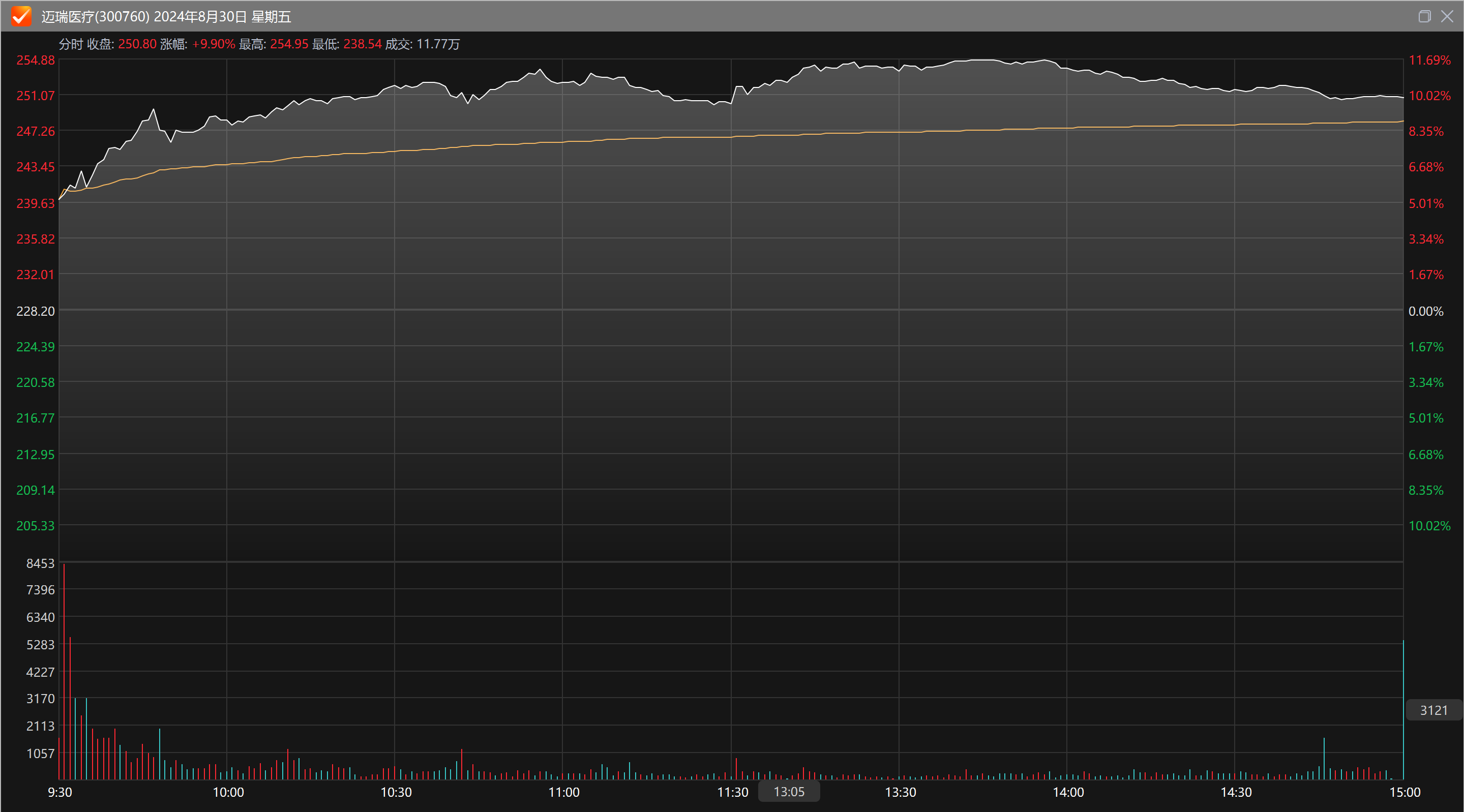 其中,总市值超2700亿的国内医疗器械龙头迈瑞医疗8月29日公告,合计持股51.47%的公司控股股东Smartco Development和Magnifice (HK)以及特定股东等,自愿承诺自2024年8月30日起6个月内不通过二级市场集中竞价、大宗交易或协议转让的方式减持其所持有的公司股份。Choice数据显示,公告次日,迈瑞医疗股价盘中最高涨近12%。