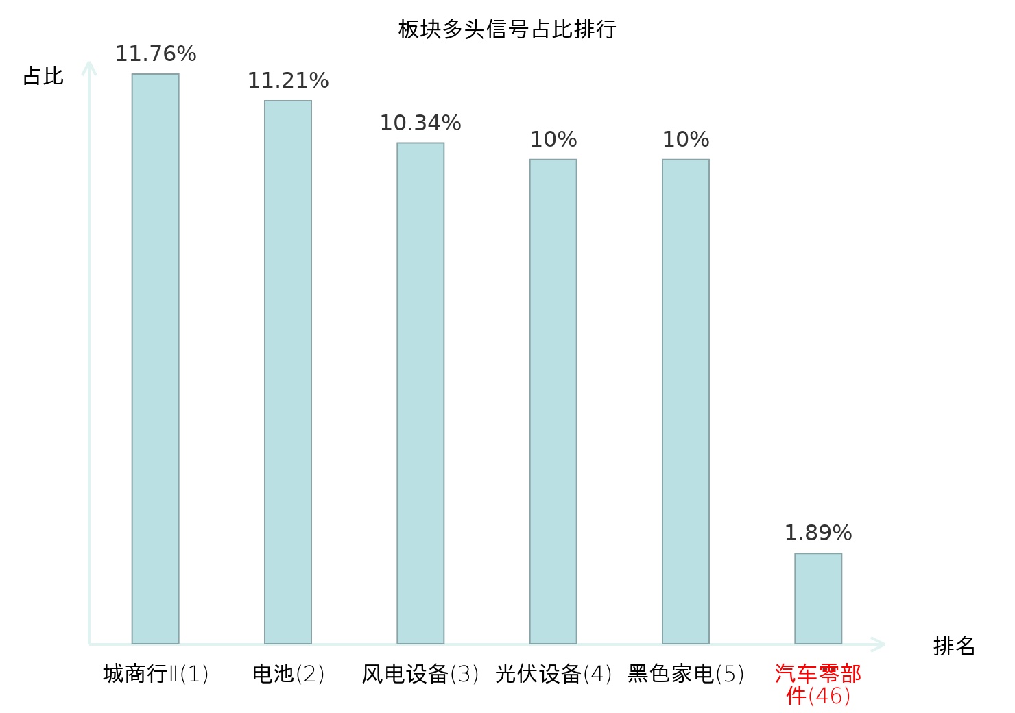 全市场所有行业板块中主力多头信号占比排名中,城商行Ⅱ板块位居第一。黑色家电板块名次提升最快,较昨日上升107位。