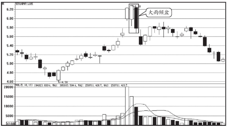 (1)大雨倾盆的成交量如果急剧放大,甚至放出近期以来的天量,则主力在高位出局的愿望强烈,跌势也将更加猛烈。并且阳线实体高出阴线实体的部分越多,转势信号越强。