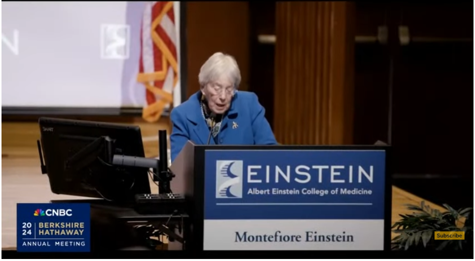 股东大会现场开始播放短片。短片中,爱因斯坦医学院董事会主席宣布,从今年8月起免除学生学费。这一决定全得益于一笔高达10亿美元的捐款,这笔巨款来自于伯克希尔-哈撒韦公司的早期投资人,与巴菲特有六十年的友情的大卫·戈特曼。