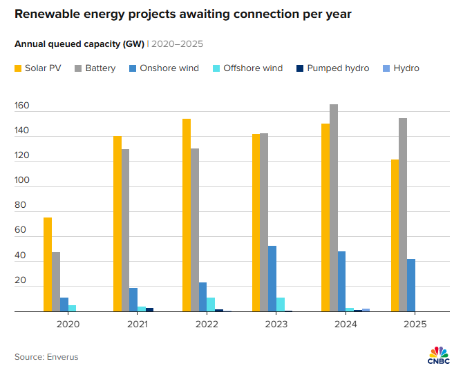 Kevin Smith表示,可再生能源是能够最快速满足需求的电力来源。根据Enverus的数据,等待接入电网的电力中超过90%是太阳能、电池存储或风能。他表示:“电力需求很大程度上将来自新能源领域,否则就无法满足。”