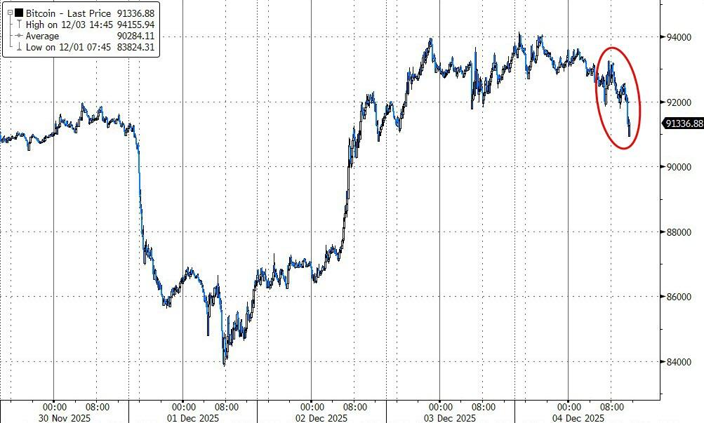 美股盘中,投资者对美联储的降息路径产生疑虑。加密货币市场再度走弱,比特币一度跌破91000美元,以太坊则一度较日高下挫逾5%。美债收益率则扭转昨日颓势,上涨近3.5基点。