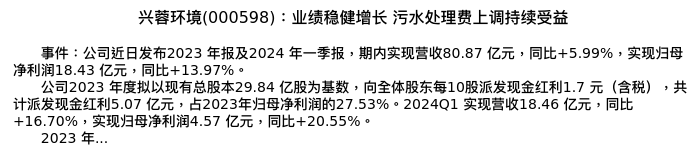值得注意的是:2024年04月太平洋的王亮/陈桉迪分析师,首次发布关于兴蓉环境的研究报告,标题为:兴蓉环境(000598):业绩稳健增长 污水处理费上调持续受益。