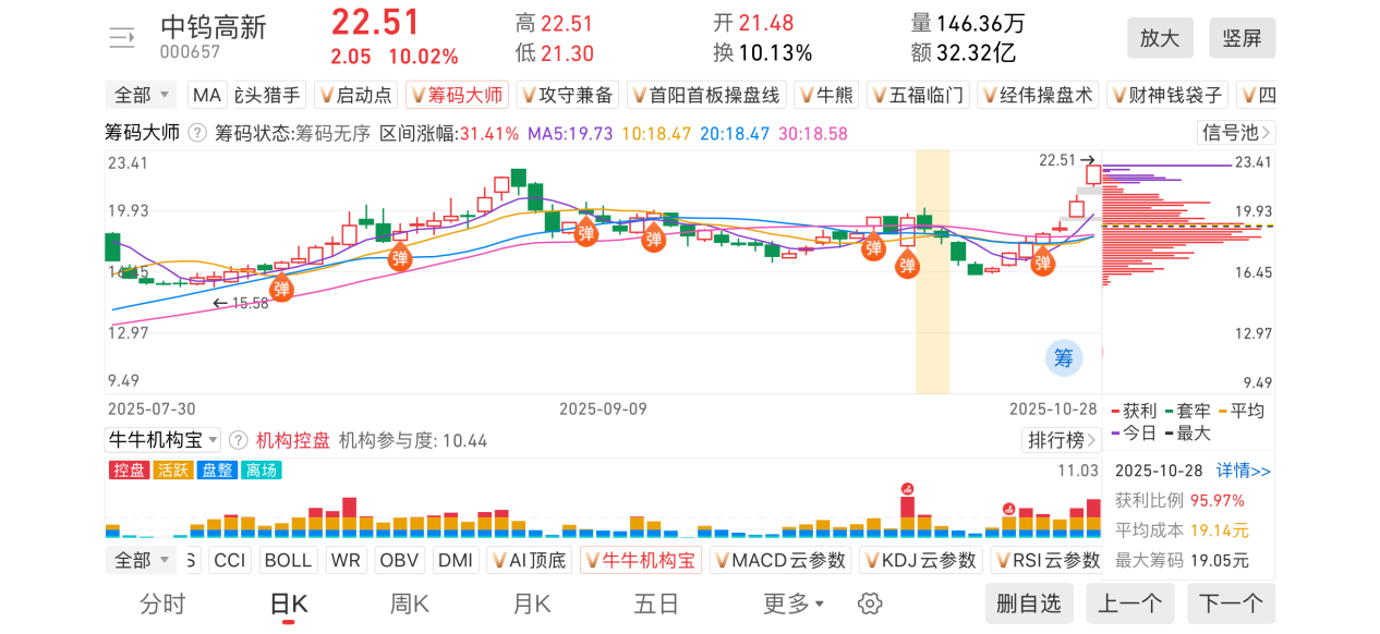 1)20251028-中钨高新-【筹码大师】和【牛牛机构宝】-近期出现弹信号且底部量柱由绿转红