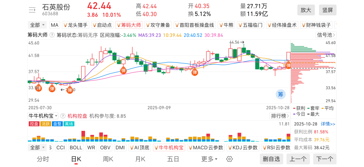 2)20251028-石英股份-【筹码大师】和【牛牛机构宝】-近期出现弹信号且底部量柱由绿转红