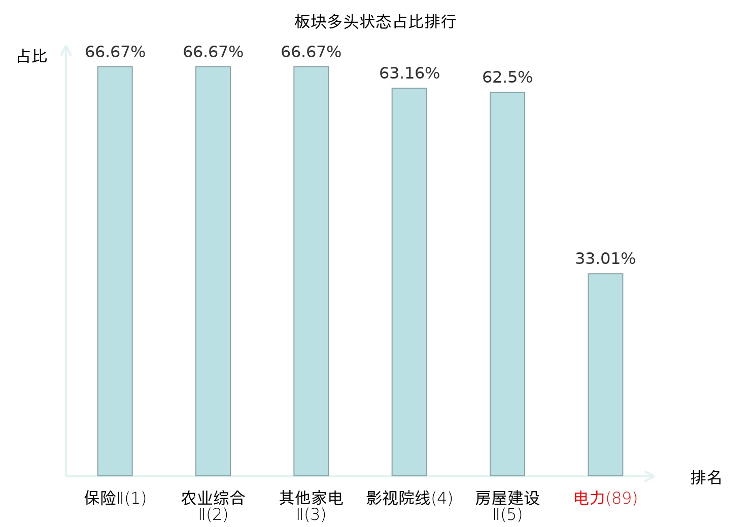 全市场所有行业板块中主力多头状态占比排名中,保险Ⅱ板块位居第一。渔业板块名次提升最快,较昨日上升103位。