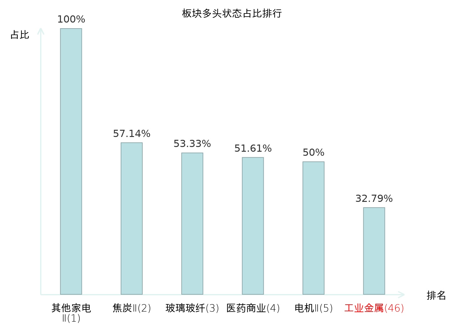 全市场所有行业板块中主力多头状态占比排名中,其他家电Ⅱ板块位居第一。白色家电板块名次提升最快,较昨日上升67位。