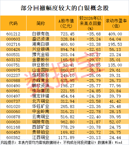 今年年初,国际银价大幅飙升,伦敦银现价格于1月29日盘中一度涨至121.65美元/盎司,打破历史纪录。近期国际银价走势趋向平稳,白银概念股走势也随之调整。数据宝统计,以2月11日收盘价与年内高点相比,超八成概念股回撤幅度在20%以上。白银有色、盛达资源、湖南白银、兴业银锡、豫光金铅等回撤幅度逾30%。