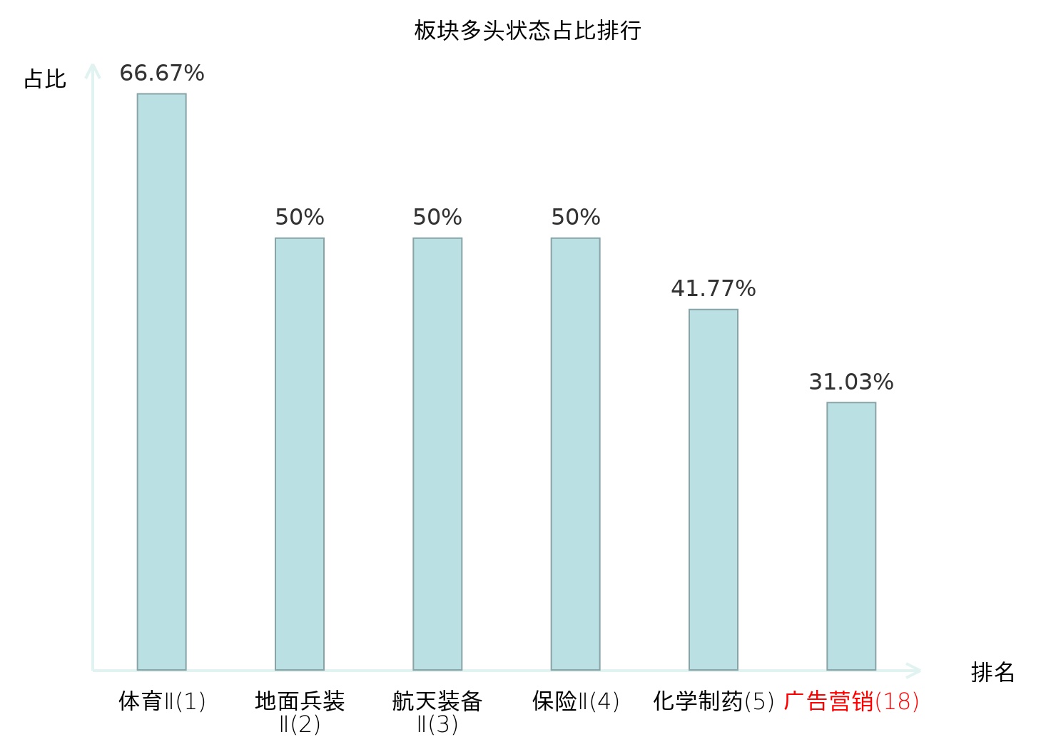 全市场所有行业板块中主力多头状态占比排名中,体育Ⅱ板块位居第一。普钢板块名次提升最快,较昨日上升98位。