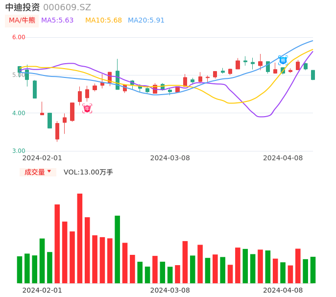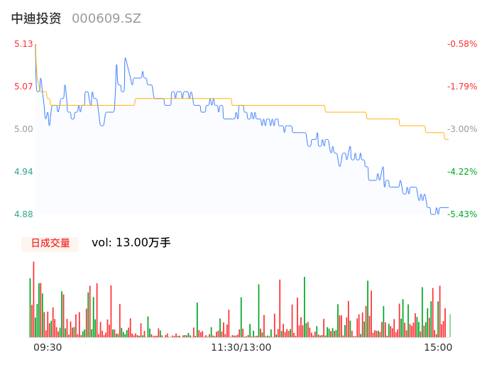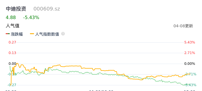 04月08日,中迪投资收报4.88,股价涨幅-5.43%,成交金额6490.85万元,换手率4.45%。