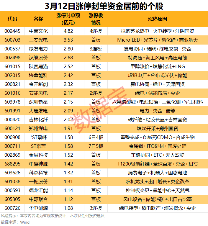 以封单金额计算,中南文化、三安光电、绿发电力等涨停板封单资金最多,分别有4.82亿元、3.53亿元、2.80亿元。