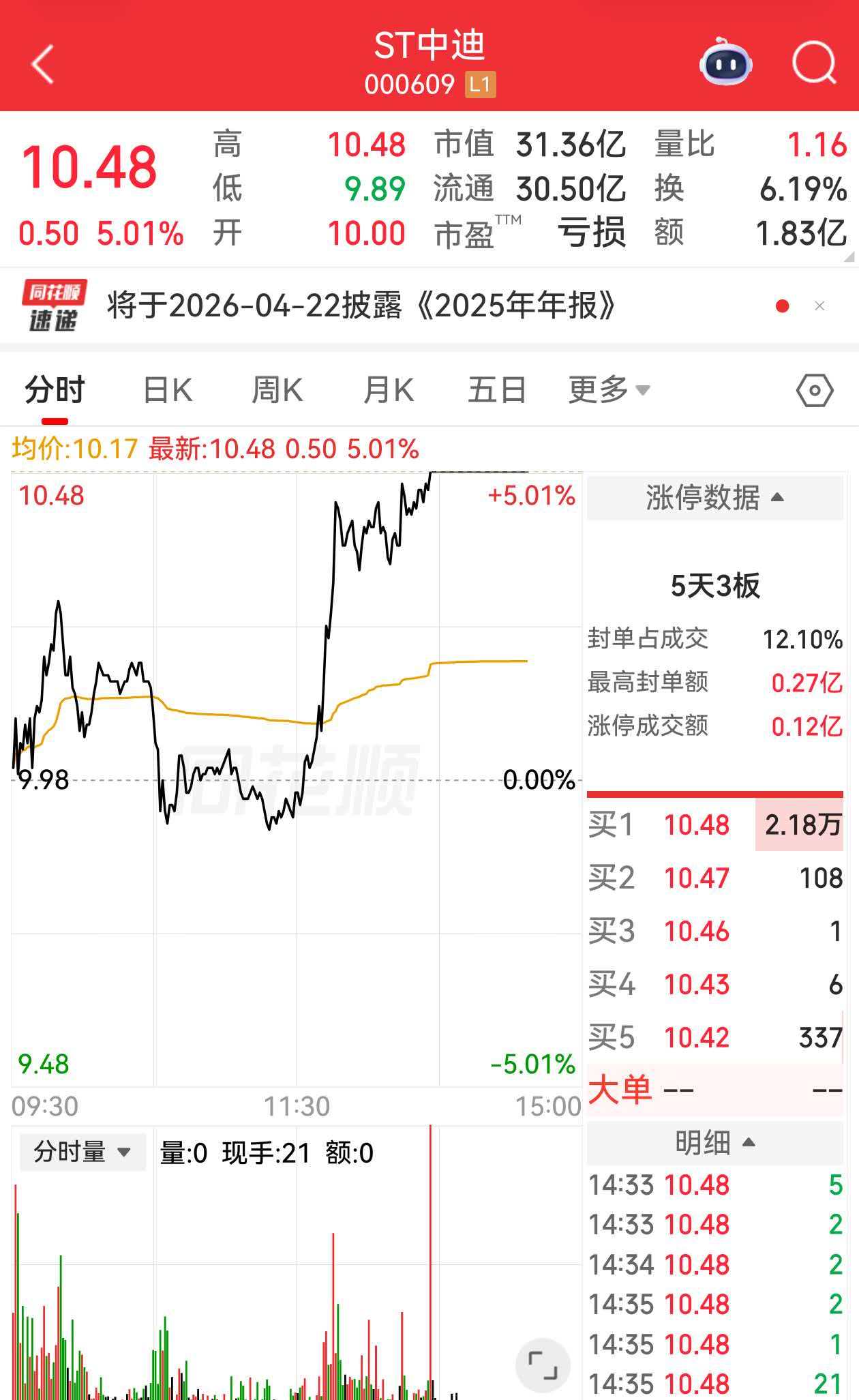 上证报中国证券网讯ST中迪盘中拉升涨停,截至3月12日14时36分涨停持续,收获5天3板。此前,公司发布公告,经公司董事会审议通过,公司董事会选举门洪达为公司第十一届董事会董事长,任期与公司第十一届董事会任期相同。