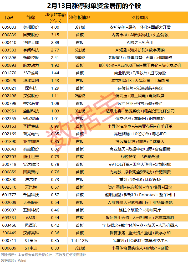 从连续涨停天数来看,ST中迪已连收7个涨停板,连续涨停板数量最多。以封单金额计算,13股封单资金均超过1亿元,其中美邦股份、国安股份、华胜天成等涨停板封单资金居前,分别有4亿元、3.15亿元、2.89亿元。