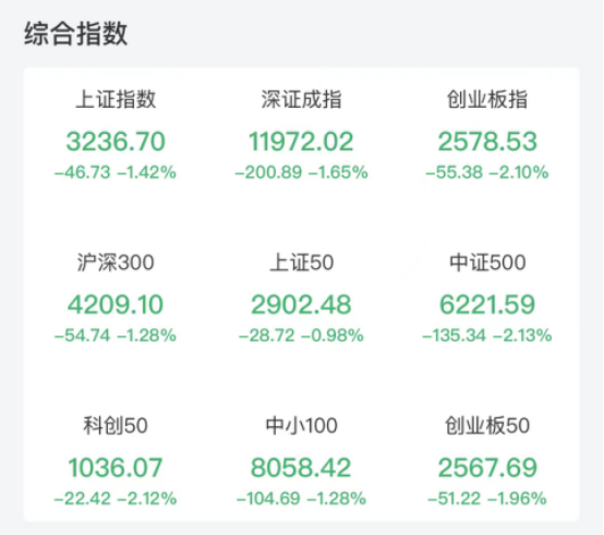 截至收盘,上证指数、深证成指、创业板指分别下跌1.42%、1.65%、2.10%。两市成交超9200亿元,较昨日缩量,其中沪市成交额为3980.82亿元,深市成交额为5248.93亿元。