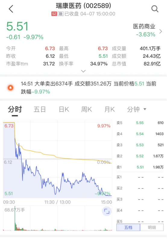此前瑞康医药连续3个交易日涨停,今日涨停开盘,涨停打开后直线下跌,尾盘跌停,全天成交24.43亿元,换手率为34.97%。