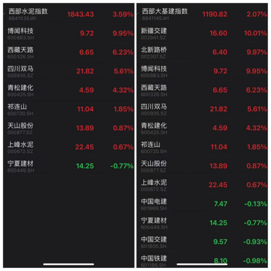 概念板块中,西部水泥、西部大基建板块逆市大涨。西部水泥板块中,博闻科技涨停,西藏天路涨逾6%,四川双马涨逾5%,盘中一度涨停。西部大基建板块内新疆交建、北新路桥涨停。