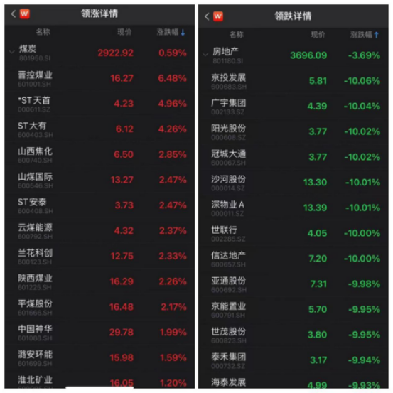 申万一级行业中,煤炭行业上涨0.59%,其他行业悉数下跌,房地产、农林牧渔、计算机行业跌幅居前,分别下跌3.69%、3.07%、2.94%。