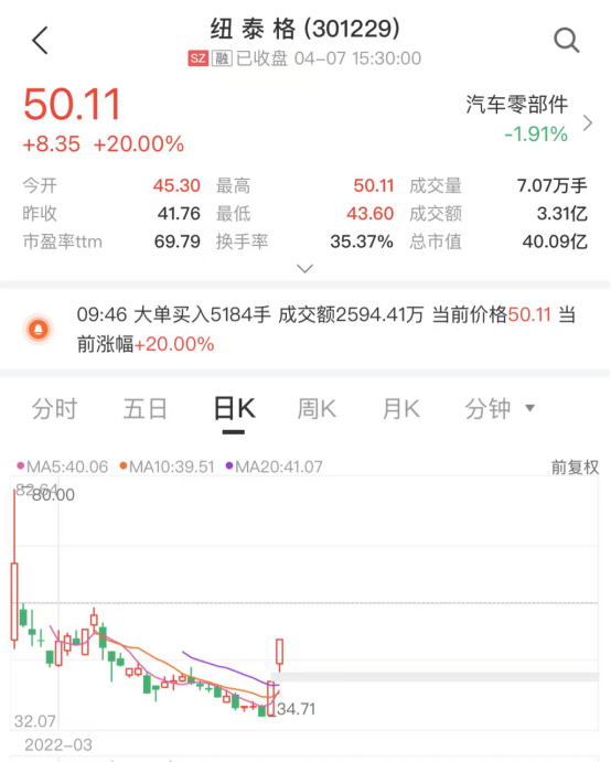 次新股纽泰格在4月1日创下历史新低之后,连续2个交易日“20cm”涨停,累计涨幅达43.99%。