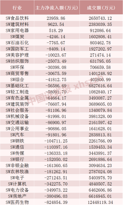 资金面上,Wind数据显示,今日北向资金小幅净流出6.09亿元,而两市主力资金净流出382.75亿元,1599只股票获得主力资金净流入,3070只股票遭遇主力资金净流出。申万一级行业中,仅有食品饮料、建筑材料、家用电器行业出现主力资金净流入,净流入金额分别为2.40亿元、0.96亿元、0.05亿元,消费板块获得主力资金的逆势加仓。医药生物、房地产、电力设备行业主力资金净流出金额居前,分别净流出82.49亿元、38.05亿元、35亿元。