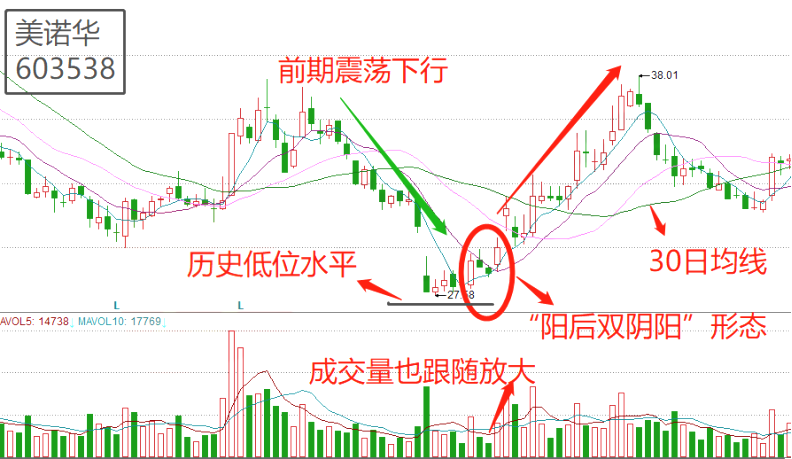 来看美诺华的个股走势图,从上图中我们能够看到该股在阶段底部出现了“阳后双阴阳”k线形态,第4根k线的收盘价与最高点都高于第1根阳线,成交量也跟随放大,符合该技术形态,看多信号明显,而后股价也是一路上行.