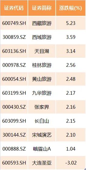 众信旅游涨幅达7%,西藏旅游上涨5.23%,三特索道上涨5.05%,西域旅游、中国中免、天目湖分别上涨3.59%、3.18%、3.14%,中青旅、桂林旅游、黄山旅游、九华旅游、岭南控股、张家界、长白山、宋城演艺、西安旅游等涨幅均超过2%。另外云南旅游、丽江股份、大东海A、峨眉山A和曲江文旅也有超过1%的微涨。