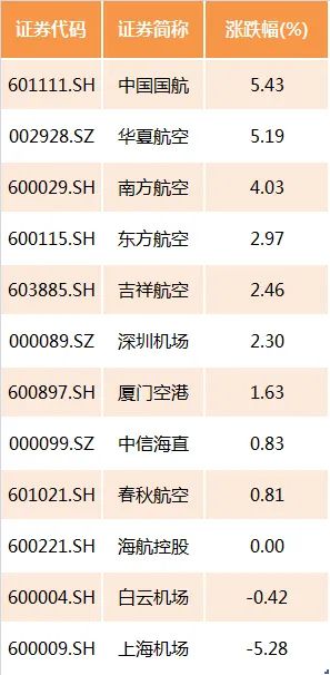 民航板块方面,中国国航涨5.43%、华夏航空涨5.19%,南方航空、东方航空涨幅分别达到4.03%、2.97%。另外吉祥航空盘中涨幅最高也达到了4.94%,报收涨幅2.46%;春秋航空收盘微涨0.81%。