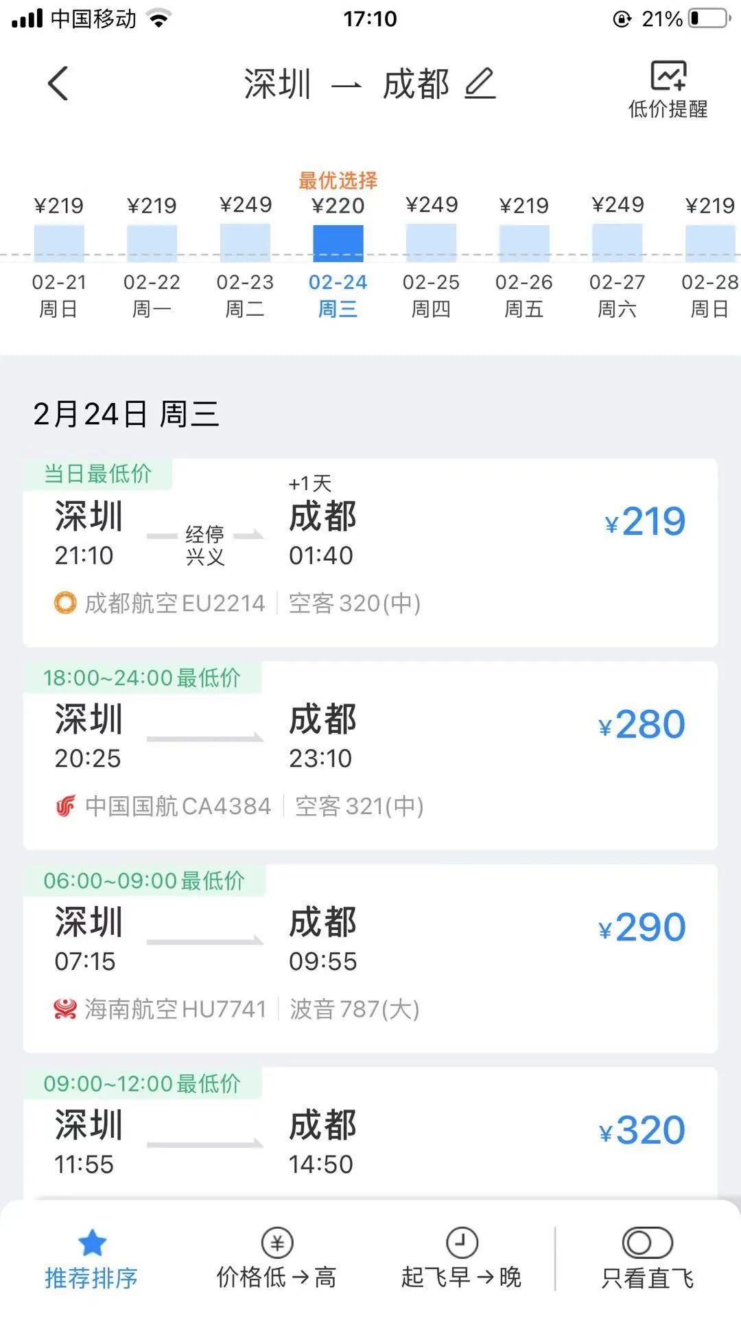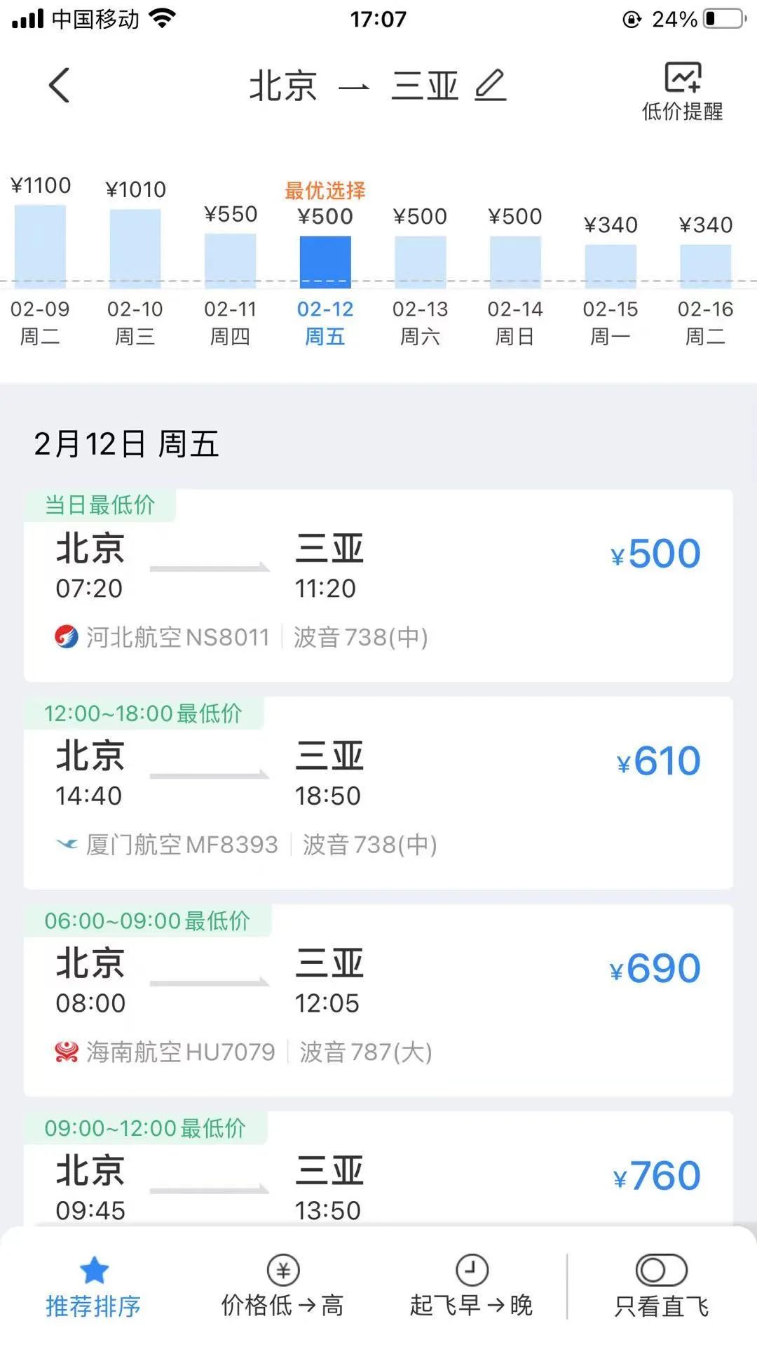 此外,以往春节的热门航线也不再“热”了。从去哪儿平台目前的搜索价格来看,腊月廿九(2月10日)出发的北京-哈尔滨航线最低支付价格(含机建燃油)跌破千元,仅为全价的5.5折。而往年商务舱都要抢的北京-三亚航线,春节放假前一天的最低支付价格为610元,仅为全价的1.7折。北京-成都今年春运平均支付价格仅为618.72元,与2019年春运期间相比下降近400元。不只北京出发的热门航线,腊月廿九(2月10日)出发的上海-哈尔滨含机建燃油的机票最低支付价格为439元,仅为全价经济舱的2.3折。