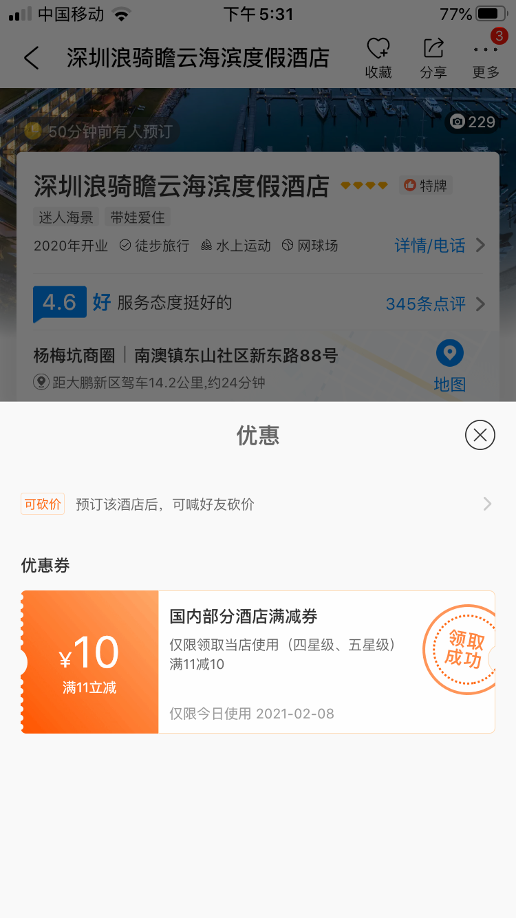 作为深圳旅游的热门区域,深圳东部的大鹏、大梅沙等片区的酒店更是“抢手”。根据大鹏新区文旅部门统计,春节期间,佳兆业万豪酒店预订量约七成、宝能桔钓沙莱华酒店预订量约五成,本周将迎来预订高峰,春节期间有望满房。