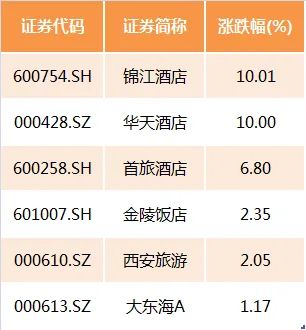 旅游酒店板块方面,截至收盘,除了华天酒店、锦江酒店涨停,首旅酒店收盘涨幅达6.8%,金陵饭店上涨2.38%。