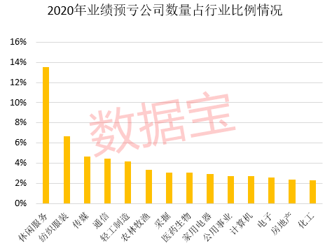 数据显示,亏损公司数量占行业总数比例最高的是休闲服务行业,达到13.51%。长白山、米奥会展、峨眉山A、云南旅游、大东海A等5家已披露业绩预告情况,均为预亏状态。比如长白山公告称,疫情使整个旅游行业受到重创,公司主营业为旅游客运,2020年客流量较 2019 年下降约70%,致使公司的业绩大幅下降,公司预计去年净利润亏损0.55亿元左右。
