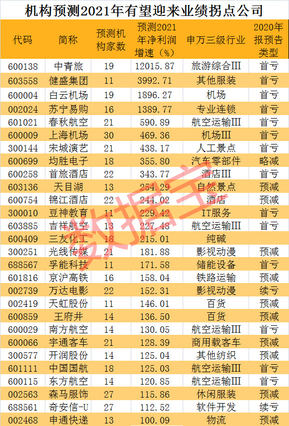数据宝统计显示,2020年亏损,2021年有望实现盈利的A股公司共有16家公司,行业分布看,以航空、酒店居多,这些公司也是2020年全年受影响最大的板块,如中青旅、春秋航空、上海机场、首旅酒店和豆神教育等。