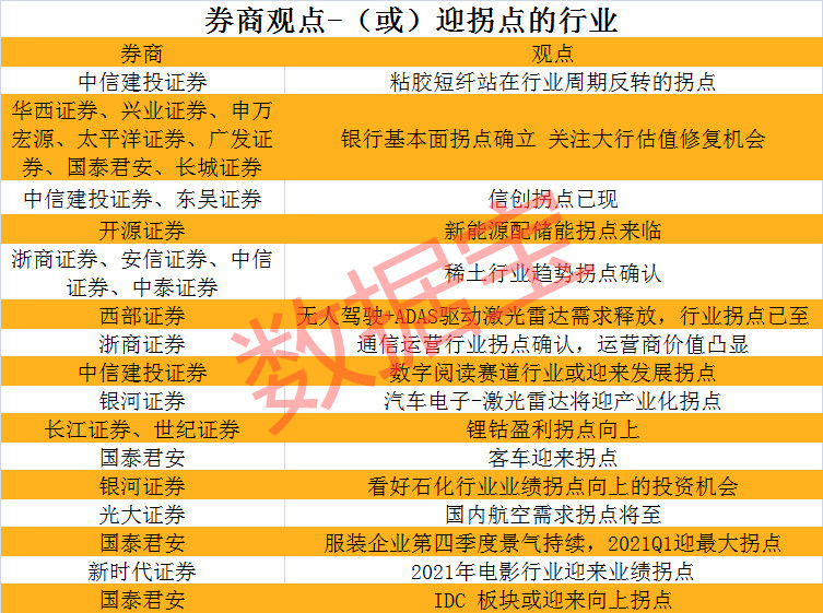 数据宝粗略统计券商机构的研究观点,发现有16个细分行业被认为业绩向上拐点已现或者有望迎来业绩向上拐点。