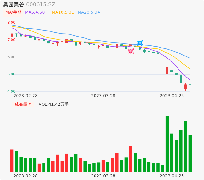 04月25日,奥园美谷收报4.38,股价涨幅-0.45%,成交金额1.83亿元,换手率5.44%。