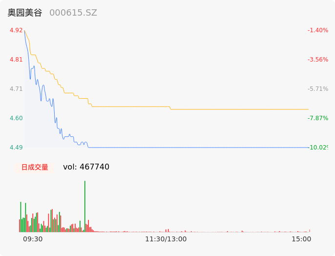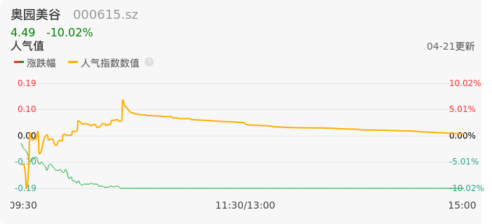 04月21日,奥园美谷收报4.49,股价涨幅-10.02%,成交金额2.17亿元,换手率6.14%。