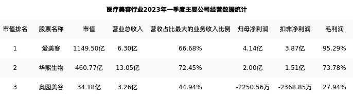 奥园美谷最新报告期数据为一季度,下表汇总了医疗美容行业内市值靠前的公司一季度主要经营数据