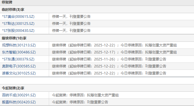 上证报中国证券网讯 12月26日,3家公司临停:*ST美谷、*ST聆达、*ST张股,2家公司复牌:百纳千成、毅昌科技。