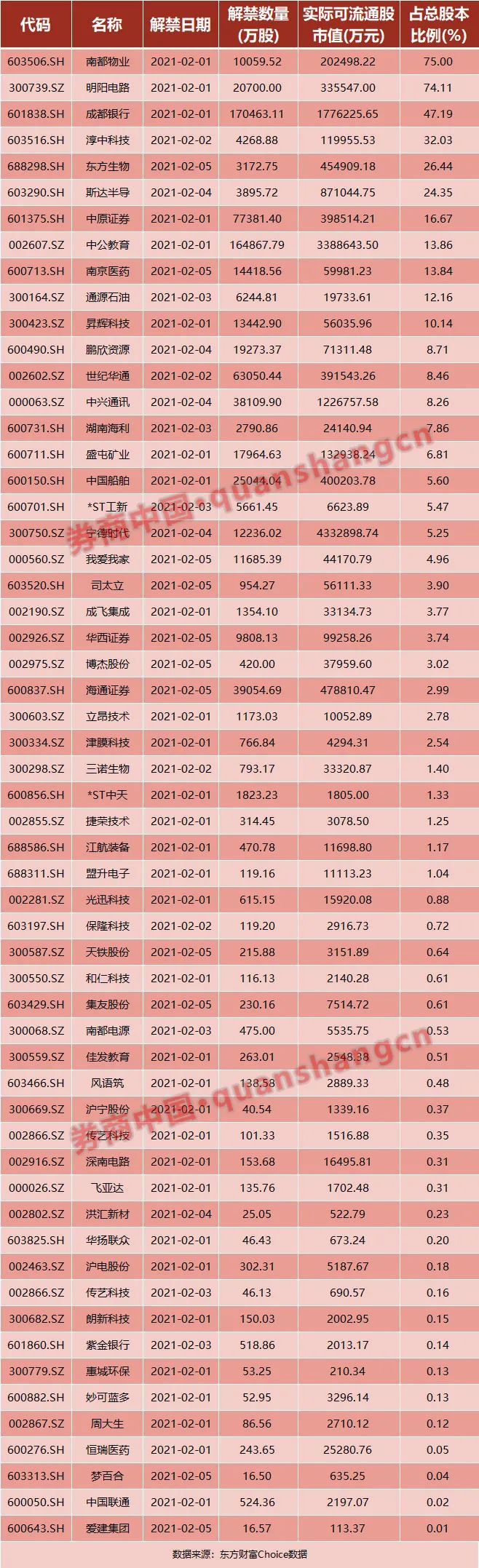 从解禁占比来看,解禁占比居前三位的是:南都物业(75%)、明阳电路(74%)、成都银行(47%)。
