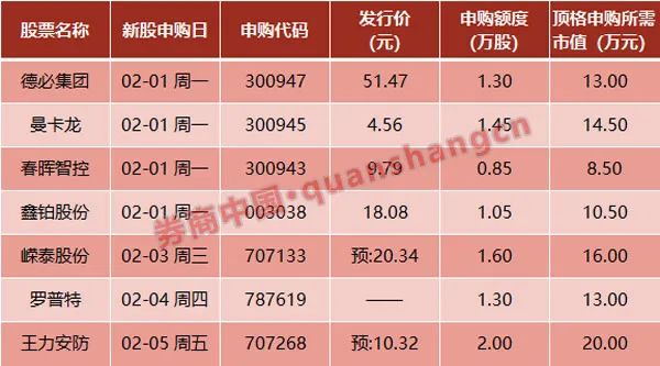 本周(21月1日至2月5日)将有7只新股发行。其中,罗普特在科创板上市,鑫铂股份、春晖智控、曼卡龙、德必集团在深市主板上市,嵘泰股份、 王力安防在沪市主板上市。