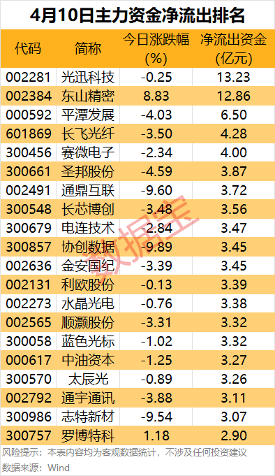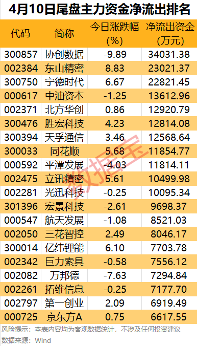 从尾盘净流出来看,协创数据、东山精密、宁德时代尾盘主力资金净流出均超2亿元;中油资本、北方华创、胜宏科技、天孚通信尾盘主力资金净流出均超1亿元。