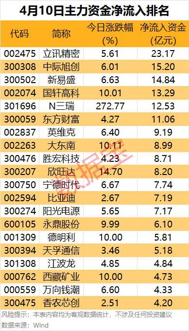 光通信概念股立讯精密主力资金净流入23.17亿元,该股已经连续两日获主力资金大幅净流入;中际旭创、新易盛、天孚通信主力资金净流入分别为15.2亿元、14.84亿元、5.18亿元。