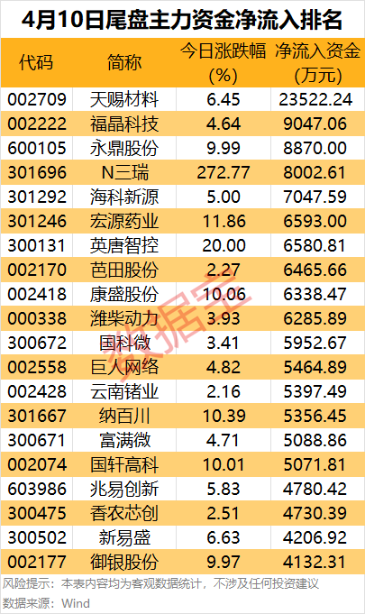福晶科技、永鼎股份、N三瑞、海科新源等个股尾盘主力资金净流入也居前。