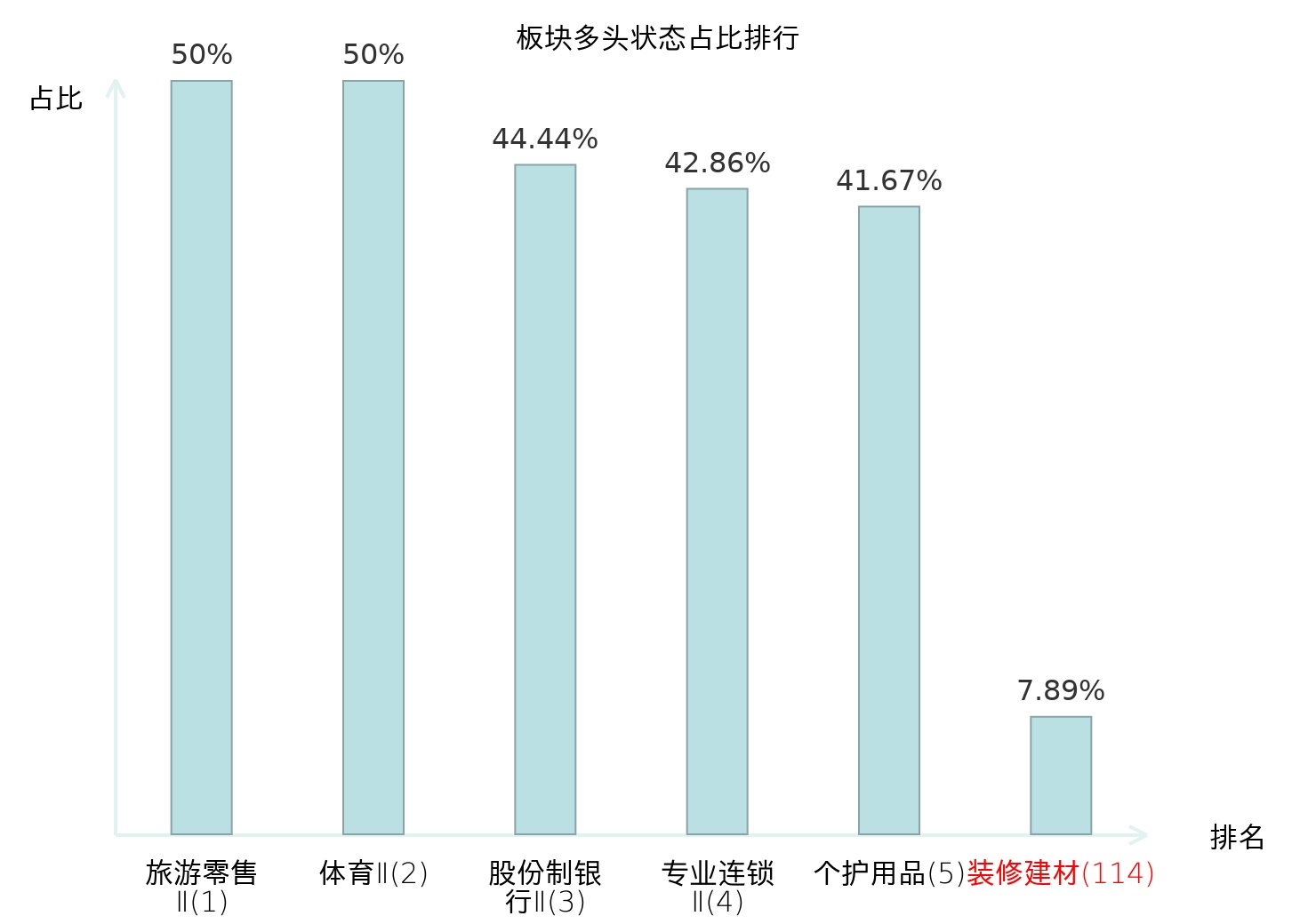 全市场所有行业板块中主力多头状态占比排名中,旅游零售Ⅱ板块位居第一。贵金属板块名次提升最快,较昨日上升83位。