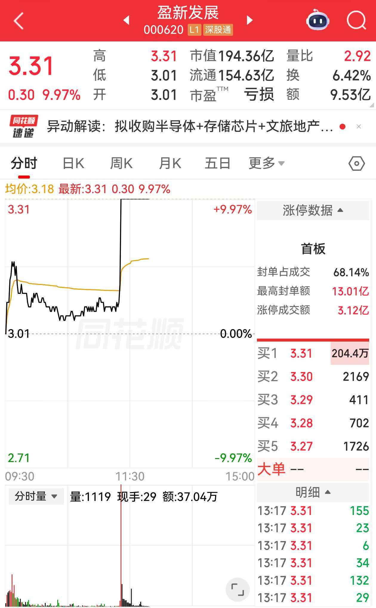 上证报中国证券网讯3月16日,盈新发展拉升涨停。近日,盈新发展在投资者互动平台回答称,关于长兴半导体未来的增资扩产及技术升级计划,属于交易交割后的经营安排。后续如有达到信息披露标准的具体规划,公司将依法合规履行信息披露义务。