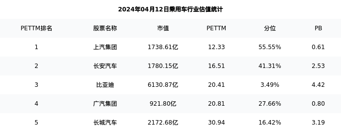 从估值角度看:长安汽车最新市盈率PETTM为16.51,在行业内排名2/8,处于41.31分位。