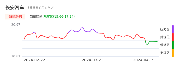 我们来看一下该股的九方特色指标强弱趋势的情况:长安汽车自04月16日从持仓区下穿到观望区,股价近期持续走弱。短期已经进入空头行情,且下跌动能仍未衰竭。建议继续谨慎观望。