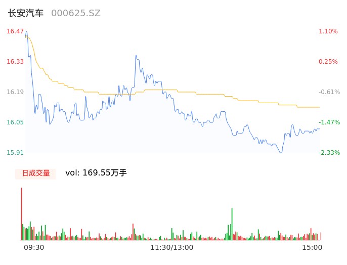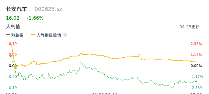 04月25日,长安汽车收报16.02,股价涨幅-1.66%,成交金额27.32亿元,换手率2.06%。