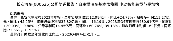 值得注意的是:2024年04月东海证券的黄涵虚分析师,首次发布关于长安汽车的研究报告,标题为:长安汽车(000625)公司简评报告:自主燃油车基本盘稳固 电动智能转型节奏加快。