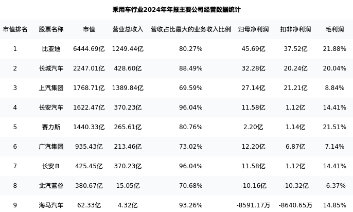 长安汽车最新报告期数据为年报,下表汇总了乘用车行业内市值靠前的公司年报主要经营数据