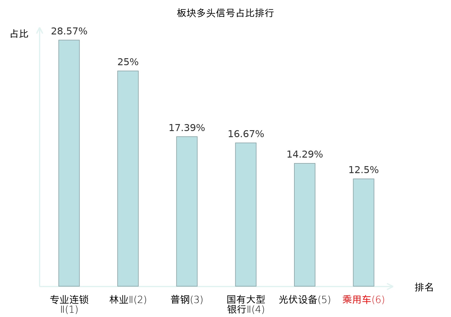全市场所有行业板块中主力多头信号占比排名中,专业连锁Ⅱ板块位居第一。专业连锁Ⅱ板块名次提升最快,较昨日上升122位。